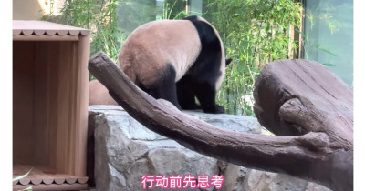 大熊貓暖暖,飼養員讓它下班它上房頂,拔起孔雀毛來也不手軟。